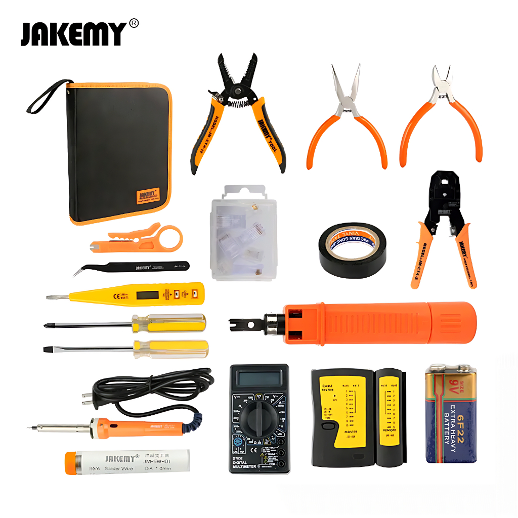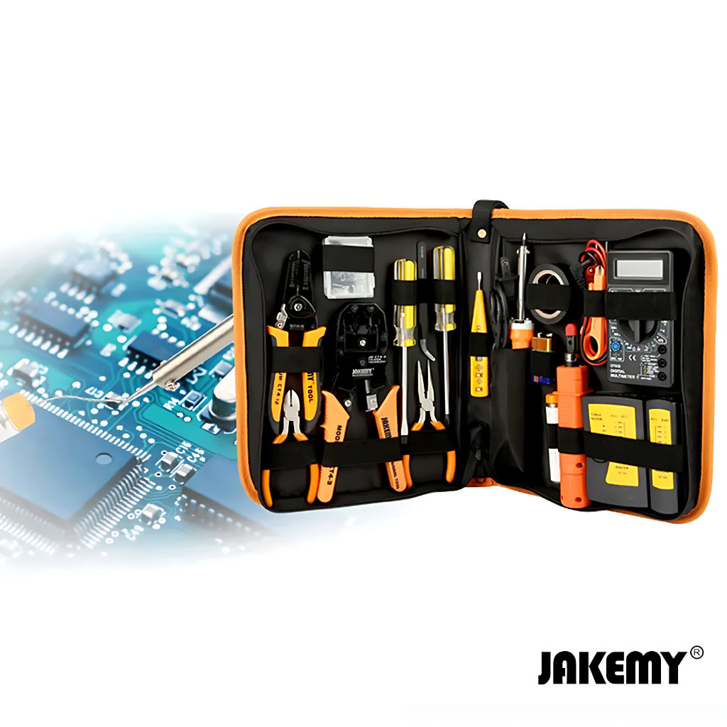 Jakemy JM-P15 dilengkapi dengan solder dan berbagai macam peralatan yang berguna untuk Anda seperti obeng, pemotong kabel, pinset, tang, tester listrik, tester kabel lan, dll.