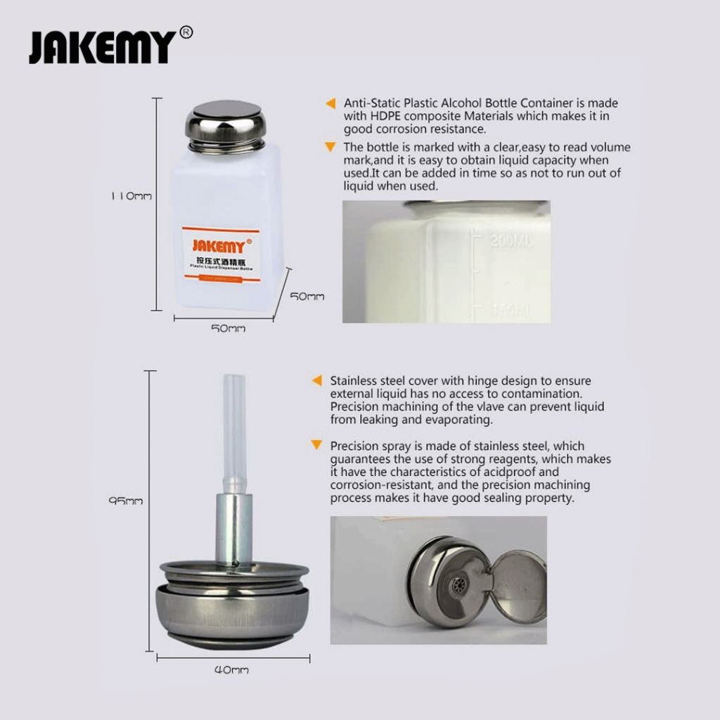 Stainless Steel Cover Jakemy Liquid Alcohol Plastic Dispenser Bottle 180mL - JM-Z11 terbuat dari bahan stainless steel yang berkualitas guna mencegah cairan yang ada di dalam botol tidak terkontaminasi.
