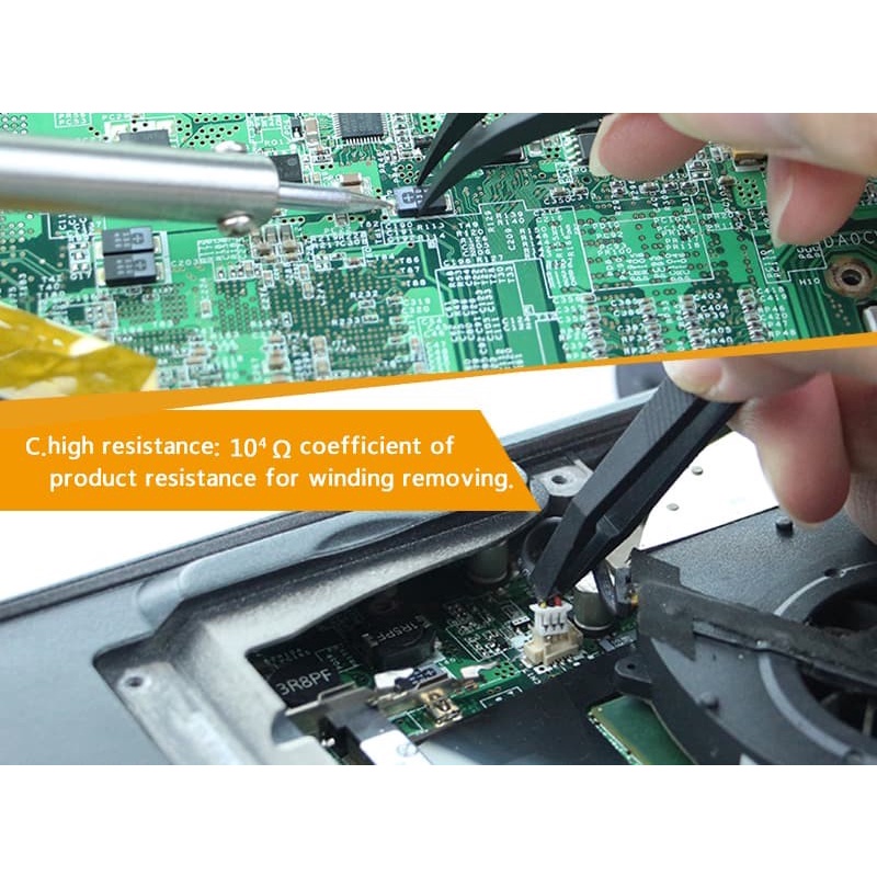 Apply to High Density Intergrated Circuit Chip Components Operating Jakemy High Anti Static Tweezers Suit - JM-T11 merupakan pinset anti statis yang dapat Anda gunakan untuk memindahkan komponen pada mainboard yang masih memiliki tenaga listrik.