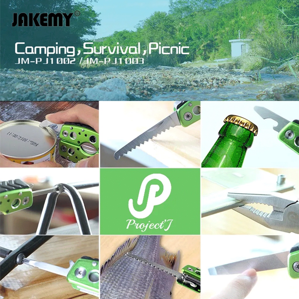 Jakemy JM-PJ1003 9 in 1 Multifunction Outdoor Folding Pliers merupakan tang potong yang didesign memiliki banyak fungsi, antara lain pemotong kayu, penghalus kuku, obeng kecil, pembuka makanan kaleng atau botol, gergaji, pisau, obeng.
