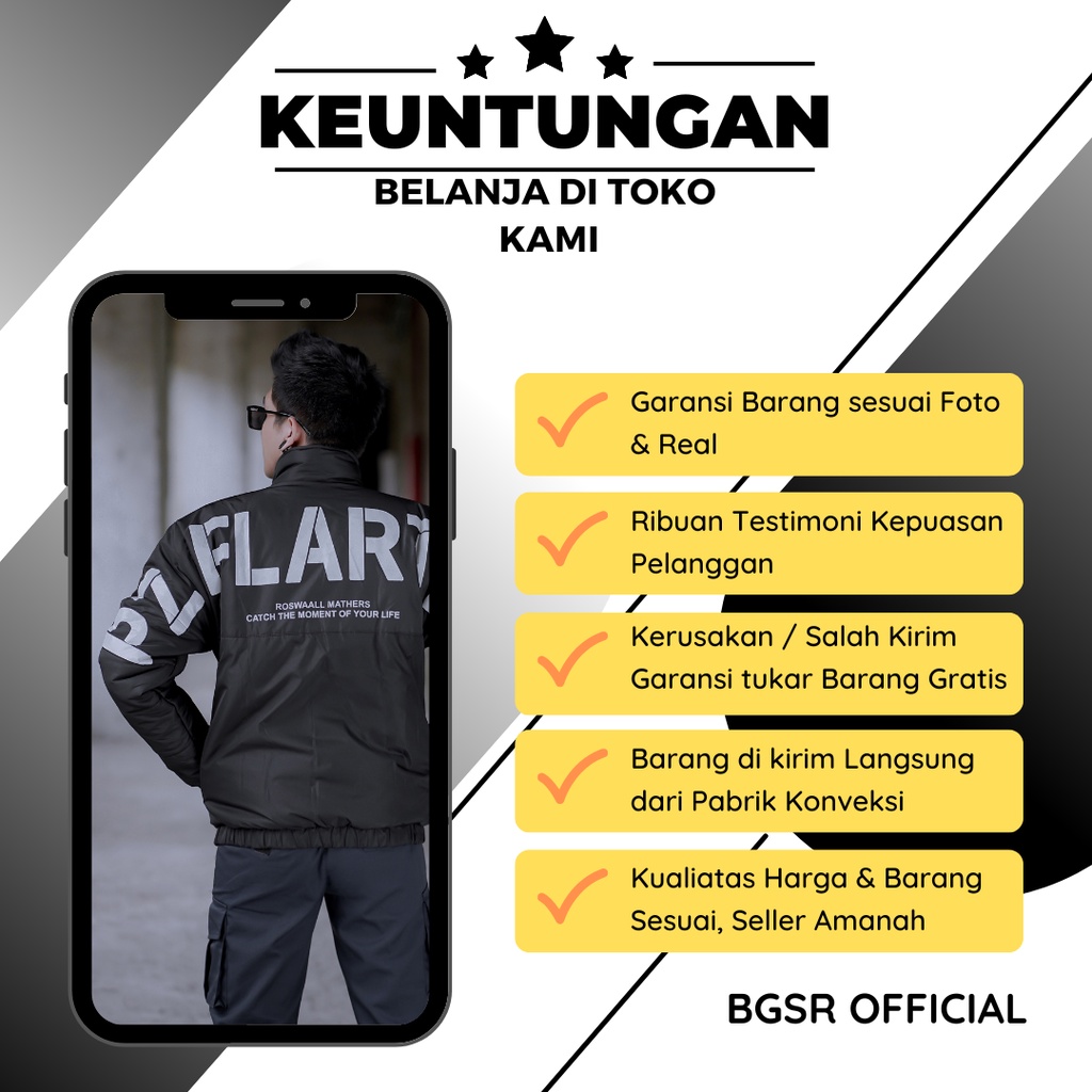 SPESIFIKASI PRODUK Model : Down Jacket Merk : BGSR Bahan : Taslan premium Warna : sesuai gambar Size : L, XL, XXL