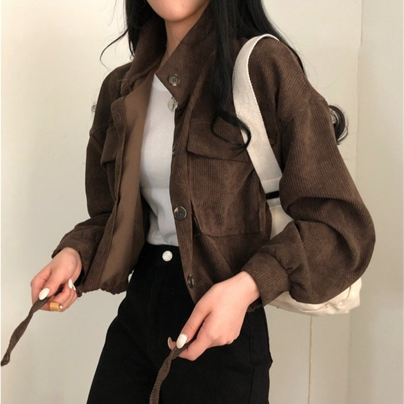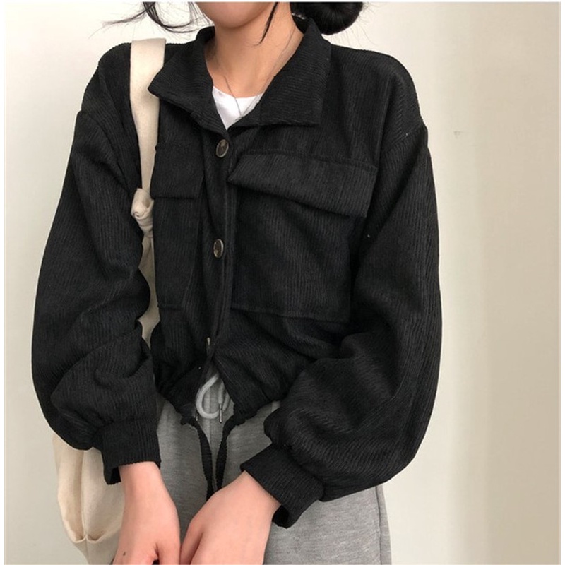 Detail Jaket Crop Corduroy Wanita Korean Style kolor Lengan Panjang Jacket Hitam