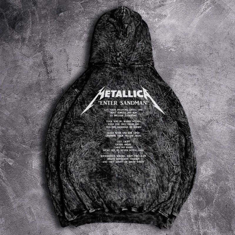 Detail Jaket Hoodie Pria METAL SANDWASH MOTIF METALICA FONT Premium Washed