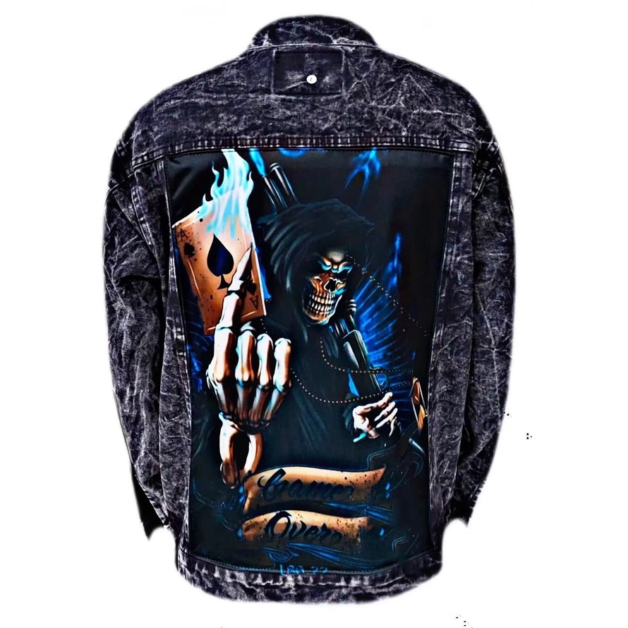 Detail Jaket Jeans Gambar Belakang Sandwash Printing - Jaket Levis Oversize Pria Wanita