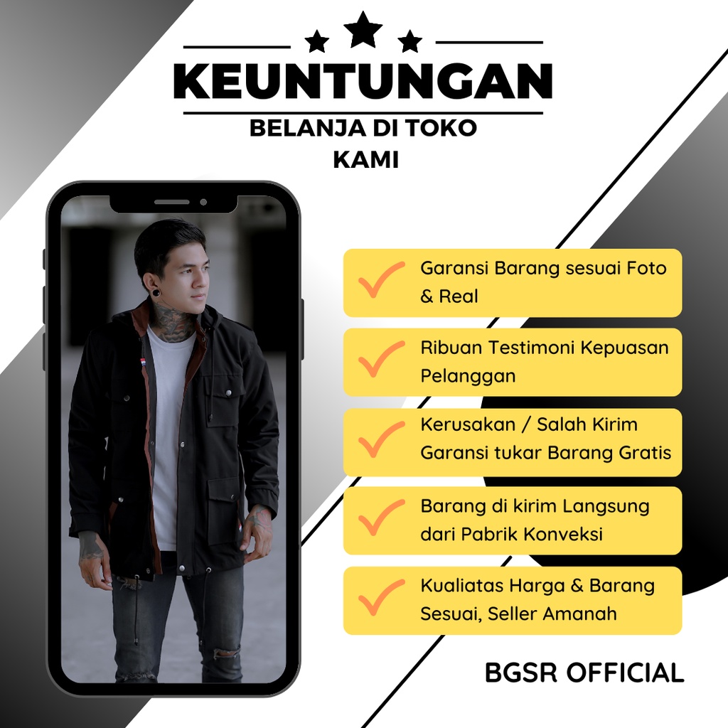 SPESIFIKASI PRODUK Model : Parka Merk : BGSR Bahan luar : Baby Canvas Bahan dalam : Polar Warna : sesuai gambar Size : L, XL, XXL
