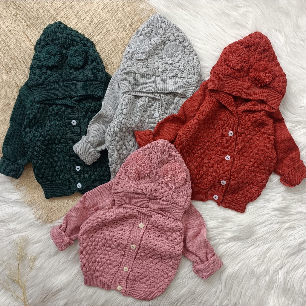 Jaket rajut hoodie pompom popcroon 3- 12 bulan / sweater rajut bayi / cardigan bayi