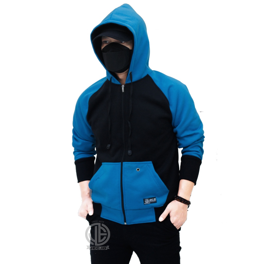 Detail Jaket Sweater Hoodie Reglan Roundhand Premium Hitam Mix Turkis