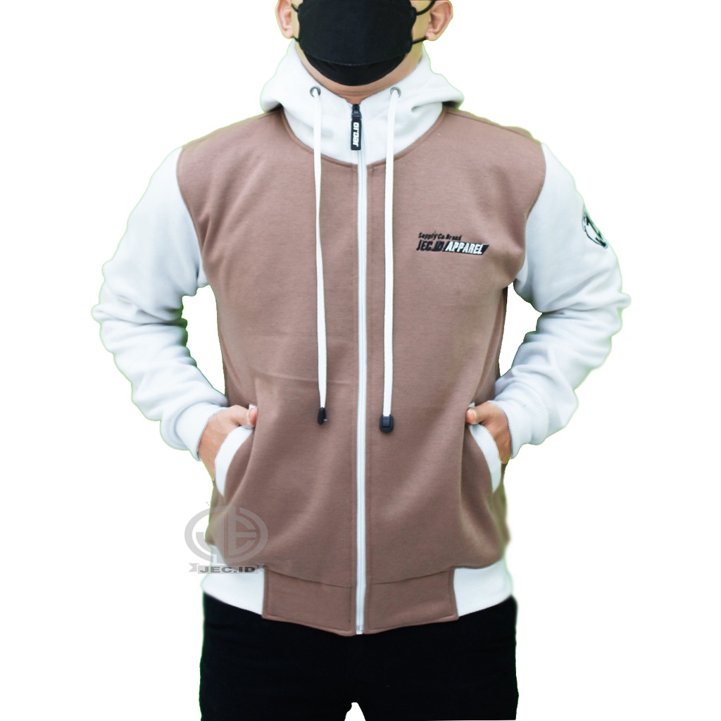 Detail Jaket Sweater Hoodie Zipper Jec Apparel Premium Mocca Putih