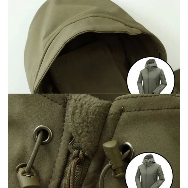 Bahan luar sharkskin softshell, bahan dalam Polar, -Waterproof (Anti Air), Made by windproof and waterproof breathable material. Lined stand up collar. Stow-away hoodie. 2 shoulder pockets with 4" x 4" velcro patch panels. 2 zipper chest pockets. Forearm pocket on the left side. Reinforced elbow. Double zipper back pocket. Sleeves with zippered underarm for ventilation. Drawstrings hood. Double zipper front opening. Interior waist drawstring. Adjustable wrist cuff. Light weight and flexible