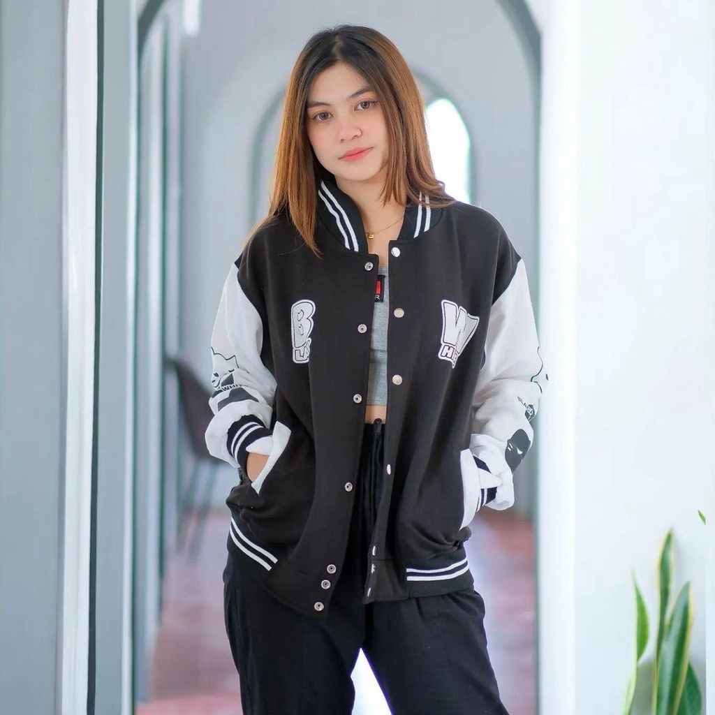 Detail Jaket Varsity Baseball Base Ball CAT BLACK WHITE bisa untuk Wanita/Pria