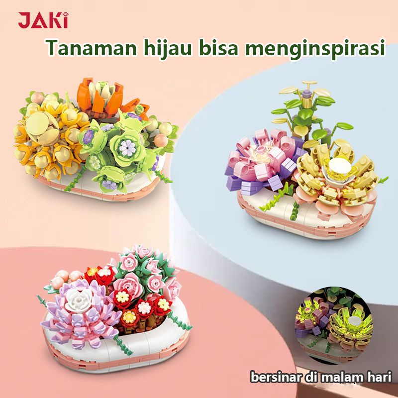 Detail JAKI Mainan Balok Pot Sukulen Blok Bangunan Bercahaya Model DIY Buket Nano Block Flowers