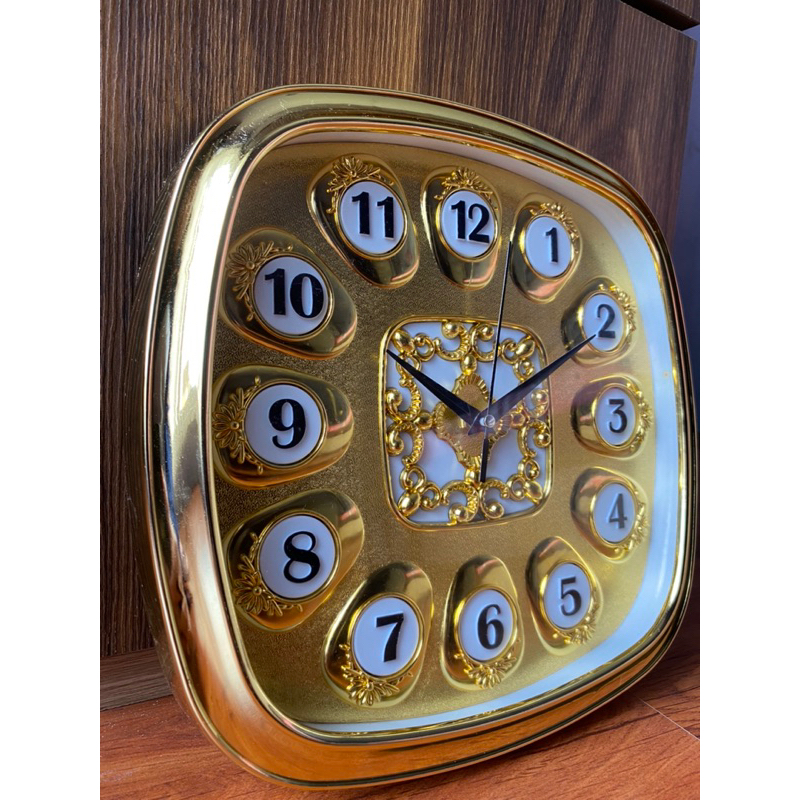 hallooo guys kita ready in jam dinding super mewah nii karna nuansa gold gitu guys cantik banget pokoknya bentuknya kotak guys untuk tebal atas 4cm untuk ukurannya jumbo dan sedang cakep banget nih dipajang diruang tamu kalian buruan checkout yuk