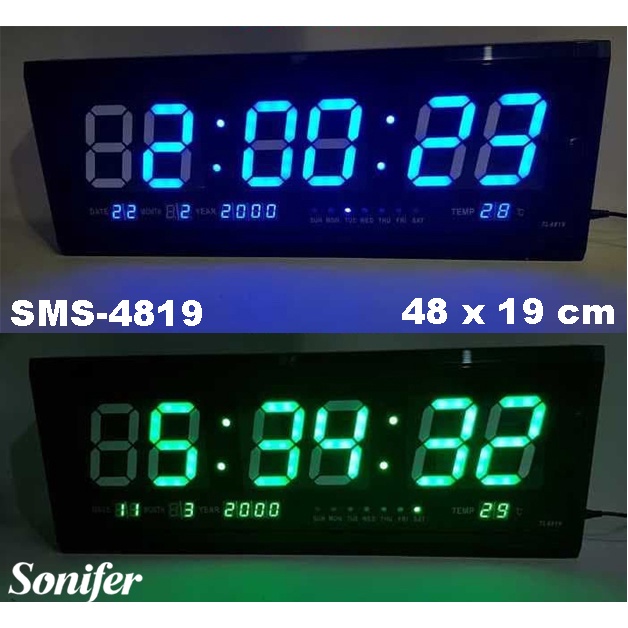 Jam Dinding DIGITAL Sonifer Tipe SMS-4819 spesifikasi : - Merek : Sonifer - Tipe : SMS-4819 - Bingkai Aluminium - Ukuran 7 segmen 8 cm (jam, menit, detik) 1,5 cm ( date, month, year) - Dimensi 48 x 18 x 5 cm