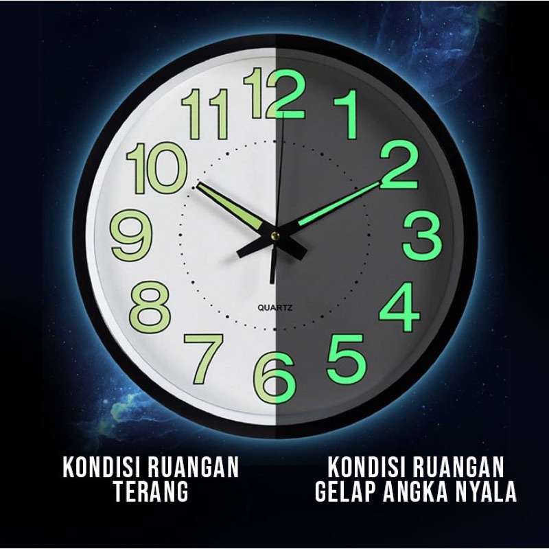 FITUR Jam Dinding Bercahaya Desain jam dinding ini dapat menyala di tempat yang gelap karena memiliki efek luminous sehingga Anda bisa tetap melihat waktu meski tidak ada pencahayaan.
