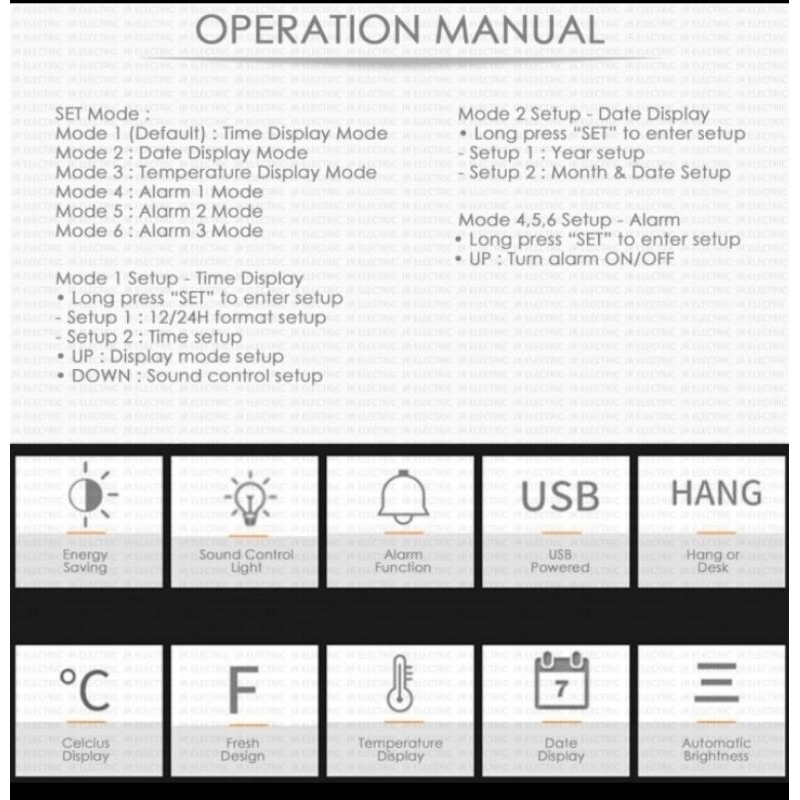 * Jam dinyalakan dengan menggunakan kabel power usb yang sudah termasuk di dalam paket, dan di colok ke listrik dengan menggunakan adapter charger. Baterai yang termasuk adalah untuk menyimpan memory setting, sehingga jam tidak perlu di setting ulang ketika suatu saat terlepas dari daya listrik seperti saat mati lampu.