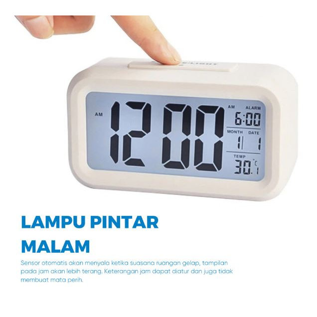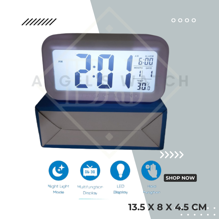 FITUR - Tampilan layar LED besar - Display dilengkapi lampu - Lampu sensor otomatis (akan menyala saat sekitar gelap) - Suara alarm crescendo yaitu alarm akan berbunyi kuat/kencang secara bertahap - Fungsi snooze yaitu ketika alarm berbunyi dan anda bisa mematikannya hanya dengan menekan tombol snooze dan alarmnya akan berbunyi kembali setelah 5 menit