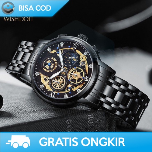 Detail JAM PRIA DEWASA WISHDOIT WATERPROOF GELANG STAINLESS KULIT BLACK ORI