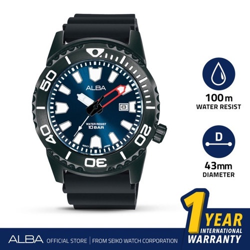 L/G Men's • Dial Blue dial • Hand Hour, minute, second • Date Date • Water Resistant 10 bar water resistant • Material Stainless steel case and screw case back • Band Black silicone strap • Glass Curved mineral crystal • Case Size 43mm