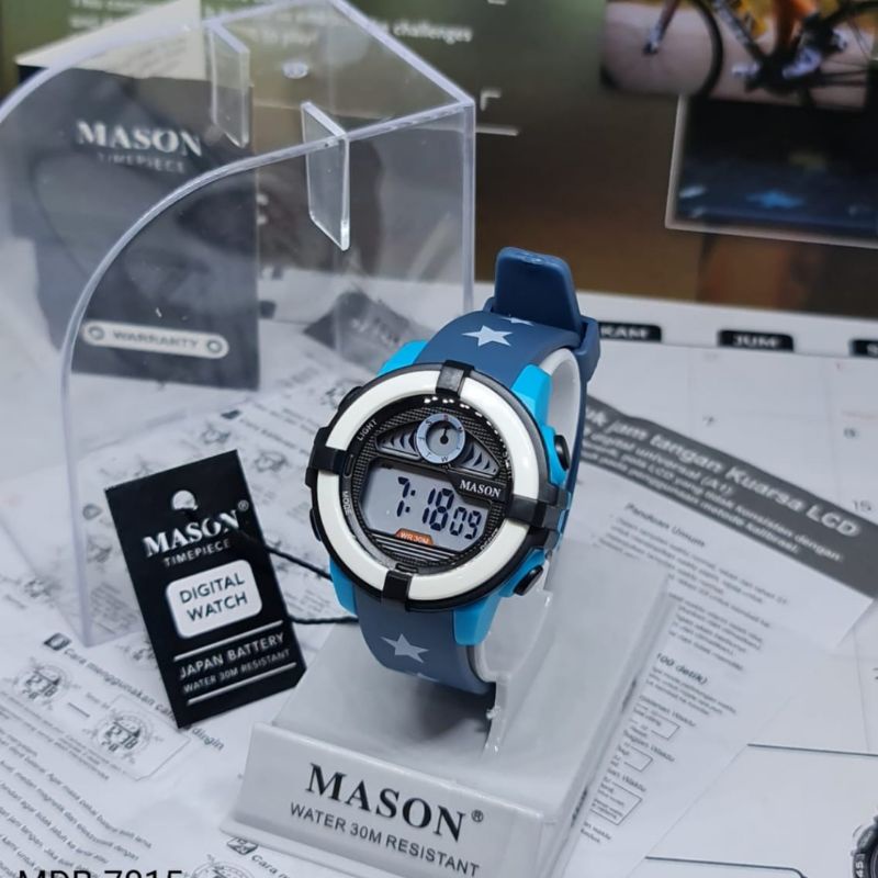 Mason MDB 7015 Kualitas : original -Diameter jam : 36,8mm -Material/body jam : abs -Mesin : digital -fitur : lampu ,alarm ,stopwatch -kalender : tanggal hari bulan -pengerak jam : baterai -tali : pu strap -Water resist/anti air : 3bar -Garansi : 6bulan