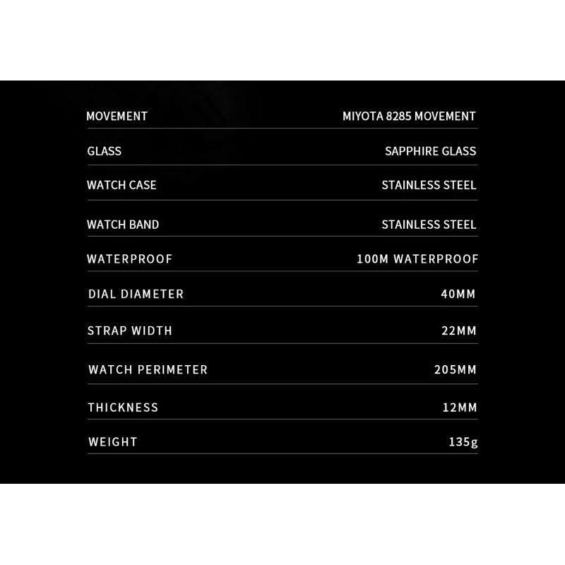 SPESIFIKASI: Merek : Cadisen Jenis Tali: Stainless Stell Bahan Case: Baja tahan karat Bahan Dial Window: Saphire Bahan Dial: Baja tahan karat Tahan Air: 50 M / 5 Atm Waterproof Tipe Mesin: Mekanik Otomatis (tanpa baterai), Miyota 8285 Diameter Dial & Case: 4 cm Ketebalan Dial: 1,2 cm Panjang Tali: 20,5 cm Lebar Tali: 2,2 cm
