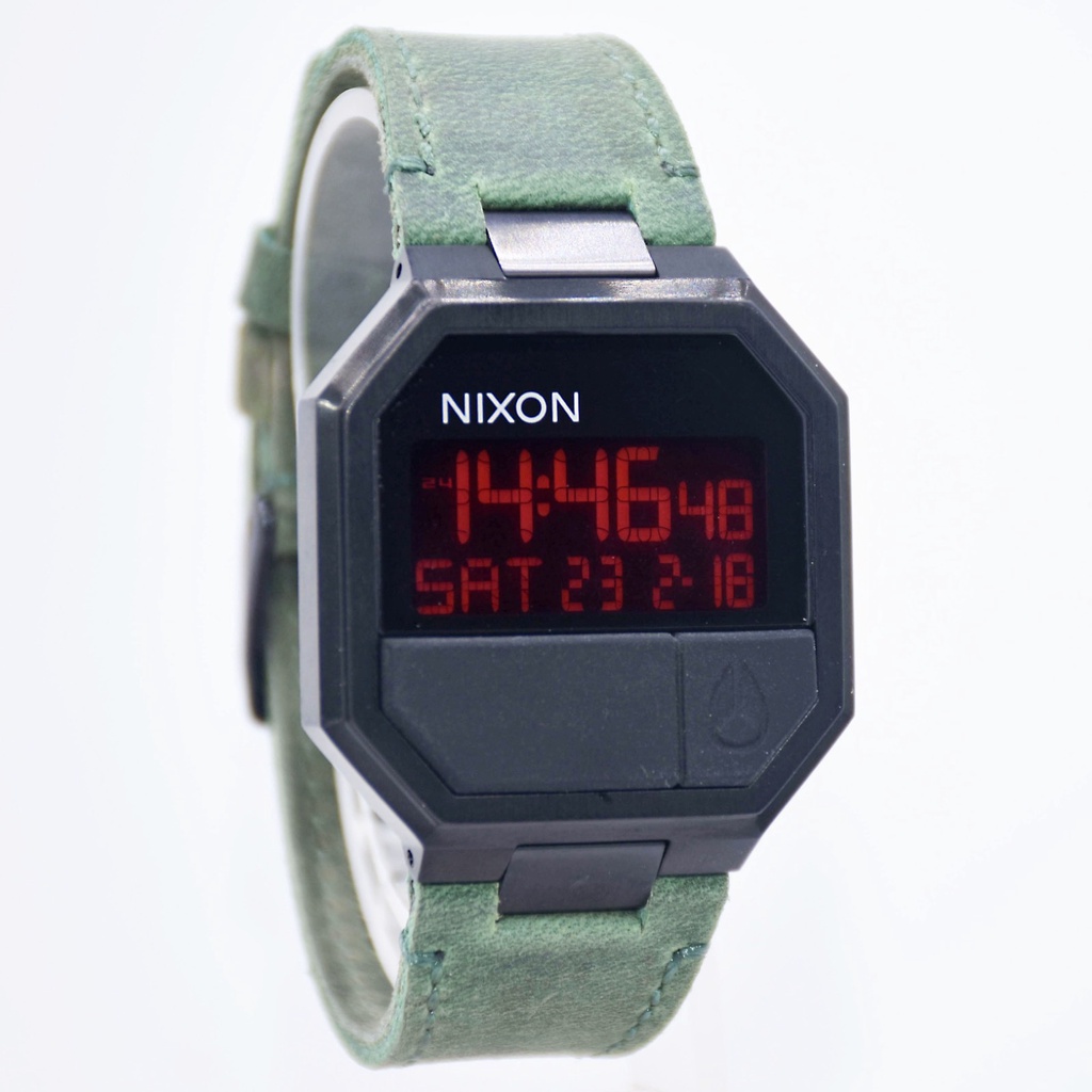 Material & Measurements Model: A944032-00 Manufacturer: Nixon Series: The Re-Run Type: Men's watch, Dress / Sport Measurements: X 38.00 mm, tonneau Thickness: 8.00 mm Case: Black steel Back case rear: Solid Bracelet: Green leather Dial: LCD-screen digital with digital markers Buckle: Tang type buckle made of steel Glass: Mineral, shatter-resistant Bezel: Steel, black Movement & Functions Movement type: Quartz (battery powered) Date: Month, day and date Water protection: 3 ATM Functions: - GMT-function - Alarm - Chronograph 180223LA