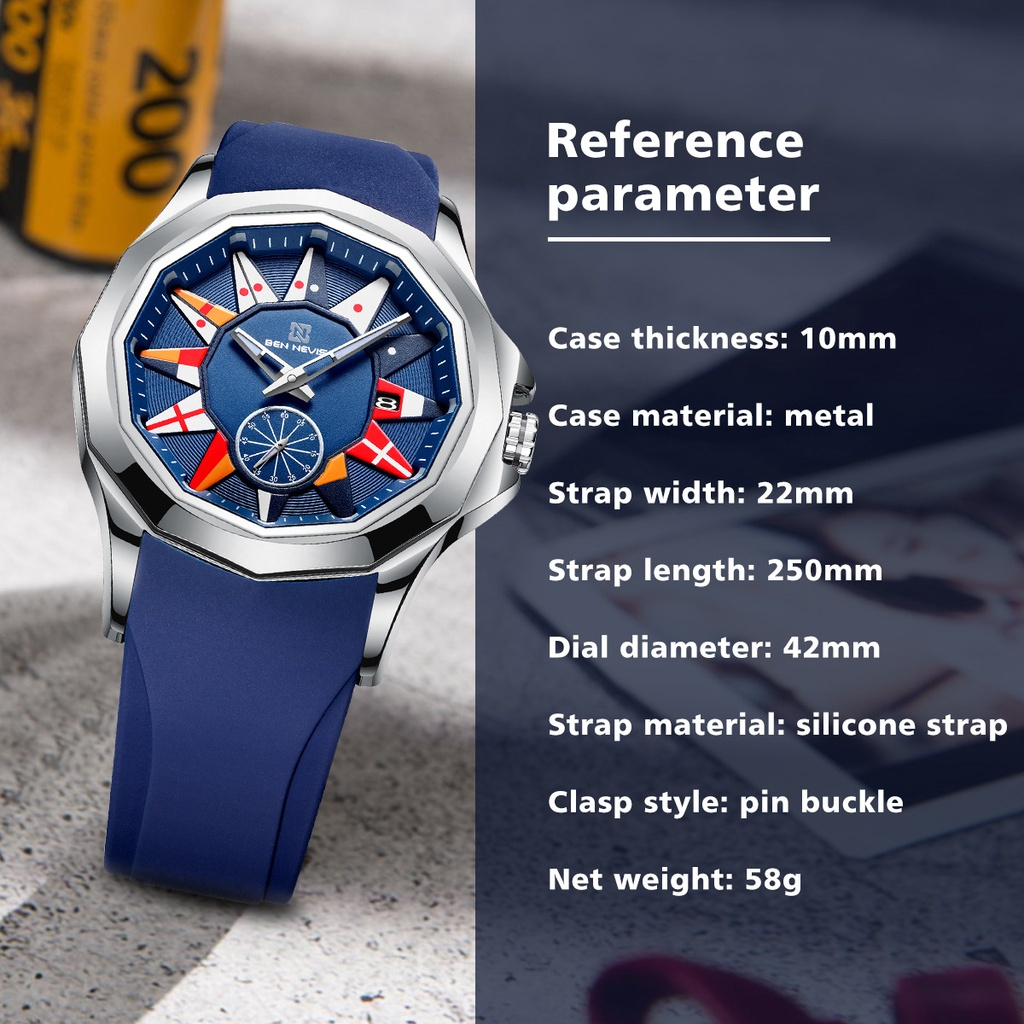 Selamat Datang di Toko Online Kami, selamat berbelanja. Kami sarankan untuk pembelian produk jam tangan disertakan pembelian aksesories agar lebih hemat dengan memilih paket combo sebelum checkout. Berbagai pilihan paket combo antara lain : - Baterai Jam Tangan - Strap Jam Tangan - Alat Potong untuk Jam Tangan Rantai (tidak perlu ke tukang service) - Anti Gores Jam Tangan Untuk kualitas produk import dengan garansi toko 6 bulan berlaku untuk kerusakan mesin. Terhitung dari tanggal pesanan sampai 6 bulan pemakaian jika produk mengalami masalah akan kami berikan service free berupa penggantian mesin, atau penggantian unit baru dengan disertai video unboxing. Setelah 6 bulan pemakaian kami berikan biaya service free dengan ongkos kirim ditanggung pembeli. Mohon dicatat no pesanan dan garansi ini berlaku untuk ulasan dengan review 5 bintang. Adapun deskripsi produk yang kami tawarkan untuk model sebagai berikut : brand: BEN NEVISBenevie Special functions: Glow in the dark,calendar Display type: Pointer intended for: adult style: leisure time waterproof: sure Waterproof performance: 30M Movement type: quartz Movement brand: Shenglong Origin of movement: China thickness: 10mm Dial diameter: 42mm Crown type: Onion crown Bottom type: ordinary Specular Shading : Mineral reinforced glass mirror Button style: Pin buckle Buckle material: stainless steel Band Material : silica gel Dial shape: diamond Case Material : alloy
