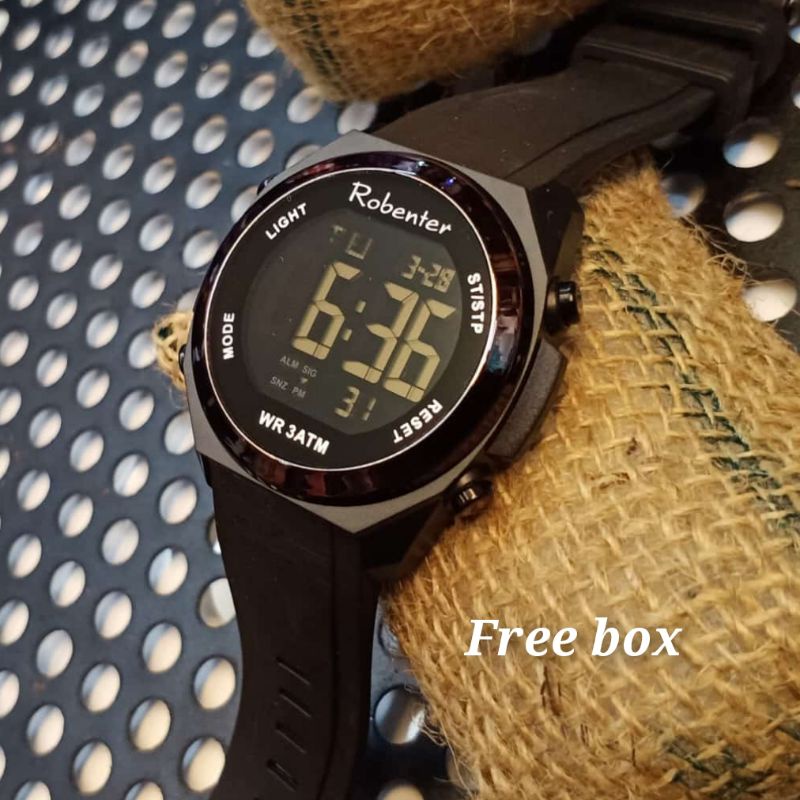 Merk : Robenter gendre : cowok bisa cewek bisa diameter : 4,5cm bisa dipakai mandi, wudhu, cuci tangan, hujan fitur : tanggal bulan hari, alarm, stopwtch, led
