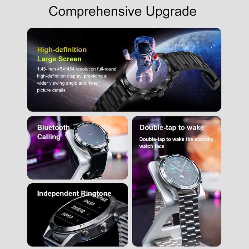 3. A good helper for daily life: 1.45-inch full round, 100+motion pattern, breathing training, dial push, stopwatch, brightness control, multi-sport mode, heart rate, information, remote music, weather, find phone (available after phone connected), bluetooth call, bluetooth music playback, password protection, calculator, split-screen display, shortcut widgets, weather, message, QR code