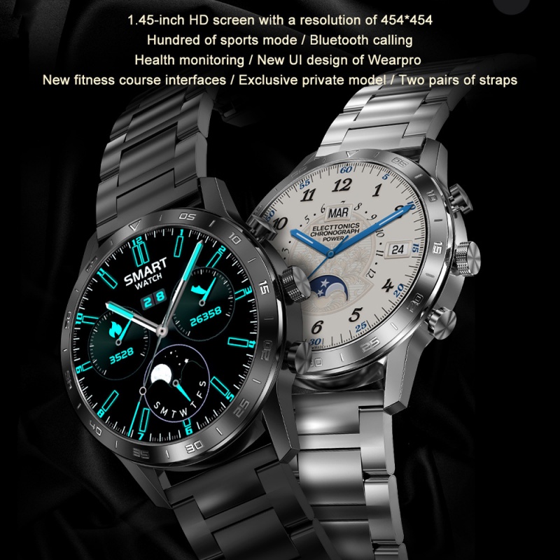 Product Parameters: 1. Model: DT70+ 2.Material: zinc alloy+IML 3. Strap material: silicone strap/leather strap/steel 4.Wristband size: 260mm 5. APP: Wearpro 6. Heart Rate Sensor: Zhangheng BD1820_I2C 7. Chip: RTL8762DK 8. Compatible system: Supports Android 4.4 and above / IOS 8.0 and above 9. Screen size: 1.45-inch full round 10. Screen type: IPS full view color screen 11. Resolution: 454*454 12. Bluetooth: Bluetooth 5.0+ Bluetooth Audio 3.0 13. Battery type: Lithium Battery 14. Battery capacity: 320mAh 15. Charging mode: wireless charge 16. Waterproof level: IP68 17. Charging time: about 3h 18. Life time: normal use 4-5 days, standby 10-15 days. (Actual use time depends on personal use)