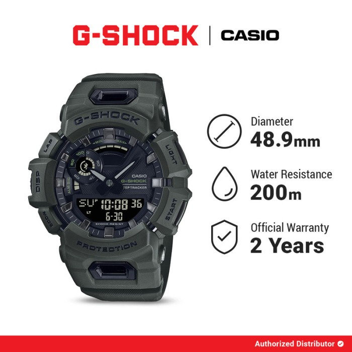 Casio G-Shock GBA-900UU-3ADR Garansi Resmi 2 Tahun Case / bezel material: Resin Resin Band Shock Resistant Mineral Glass 200-meter water resistance Double LED light LED light for the face (Auto LED light, Super illuminator, selectable illumination duration (1.5 seconds or 3 seconds), afterglow) LED backlight for the digital display (Auto LED light, Super illuminator, selectable illumination duration (1.5 seconds or 3 seconds), afterglow) Mobile link (Automatic connection, wireless linking using Bluetooth®) Hand shift feature (Hands move out of the way to provide an unobstructed view of digital display contents) Lifelog calculation function (Calorie and distance calculations based on step count), Including basal metabolic rate Daily data display: Step count, calorie, distance User profile creation Airplane mode Dual time (Home city time swapping) 1/100-second stopwatch Countdown timer 5 daily alarms Hourly time signal Low battery alert Power Saving Full auto-calendar (to year 2099) 12/24-hour format Diameter 49mm Size of case : 51.3 x 48.9 x 16.6mm