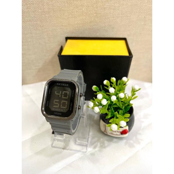 ----- SPESIFIKASI JAM ----- Brand : SKYMAX Band Material Type : Rubber Band Width : 24mm Case Shape : Round Case Thickness : 14mm Case Material : Plastic Clasp Type : Buckle Display : Digital Diameter Case : 54mm Dial Window Material Type : Mineral Glass Feature : Light, Date, Stopwatch, Hour, Minute, Second Movement : Quartz Power Source : Battery Style : Sport Water Resistance : 3 ATM