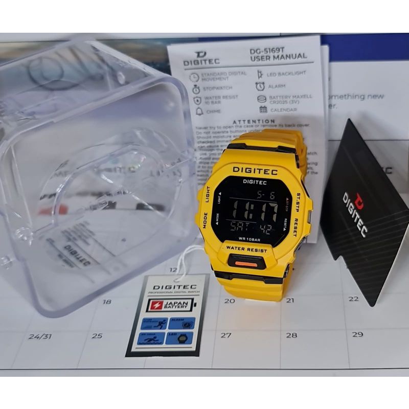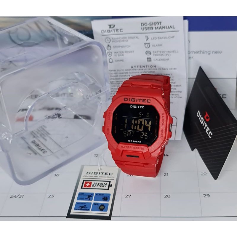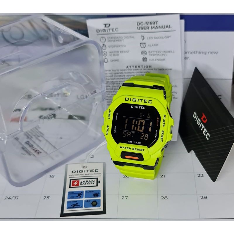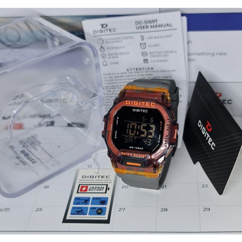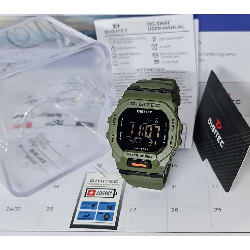 Type: DG 5169 Mesin: Digital Tenaga: Baterai Diameter : 46mm Bahan Strap: Polyurethane / Rubber Strap Water Resist 10 BAR Gender: Pria . Functions (Fungsi & Fitur) : Time: Jam/ Menit/ Detik (AM/PM or 24-Hour Display) Calendar: Month / Date/ Day (Bulan / Tanggal / Hari) Alarm: Jam & Menit , Hourly Chime Stopwatch : Jam, Menit, Detik (1/100 sec) LED Backlight