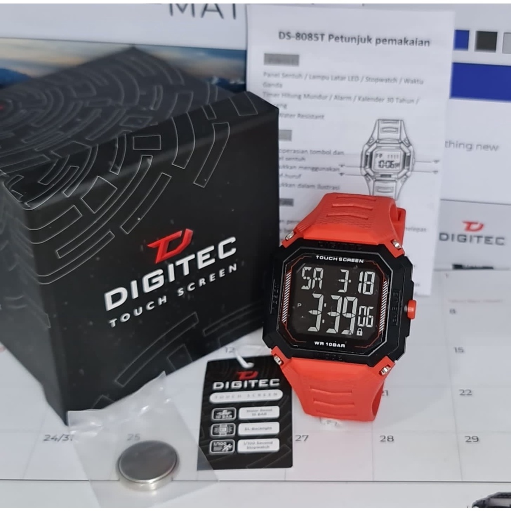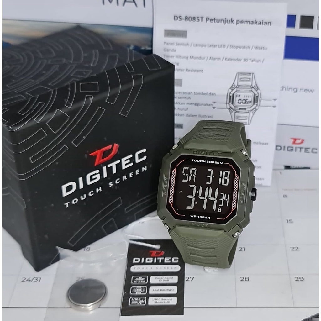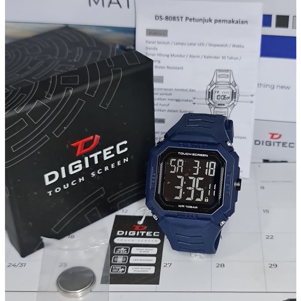 Jam Tangan Digitec Merk: Digitec 8085 Touchscreen Gender: Pria Diameter: ± 4,4cm Resin Case PU Strap 32MM x 20MM Mesin: Quartz Strap: Rubber Qualitty: Original Kegunaan: Jam, Tanggal, Stopwatch, Alarm Water resistant: 10 Bar