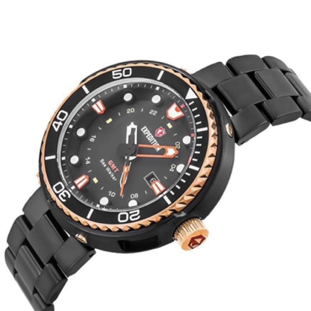 Case diameter: 50 mm Case thickness: 17 mm Water resistant: Divers watch 200 meters/20 ATM/20 BAR Case material: Stainless Steel Case back: Screw case back Glass material: Mineral crystal Strap material: Stainless Steel Calendar: Date Luminious / LumiBrite: Yes Movement: Quartz Dial color: Black Feature: Date display