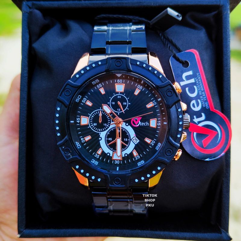 Jam Tangan Pria Kasual Analog Quart Strap Rantai Stainles Steel Fitur Tanggal Aktif Water Resistantce _Free Box Jam Tangan Pria V Tech Original Tahan Air Reasy Stok COD_ Jam Tangan Kasual Pria Anti Air Free Batrai Cadangan Warna Hitam, Hitam Rosggold