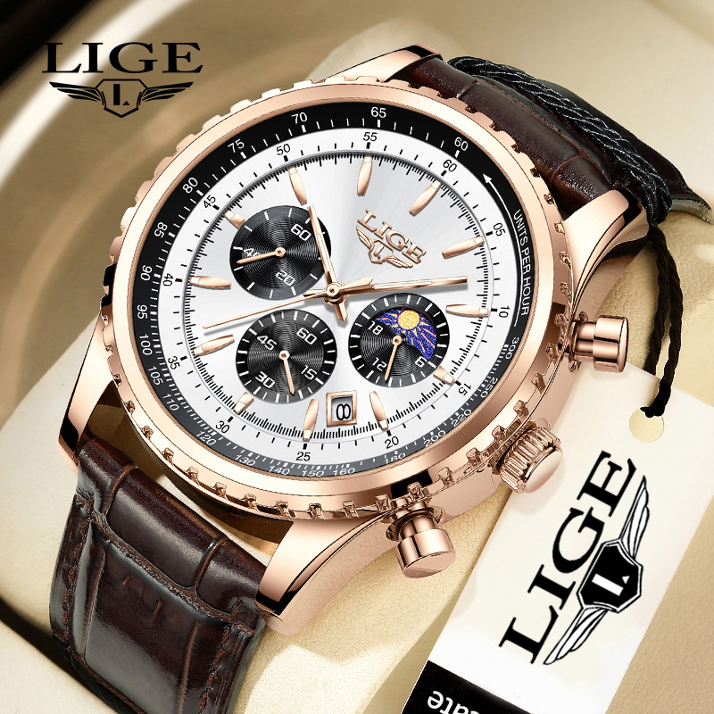 Detail Jam Tangan Pria LIGE Merek Teratas Kuarsa Olahraga Mewah Kulit Kronograf Tahan Air Jam Tangan Pria