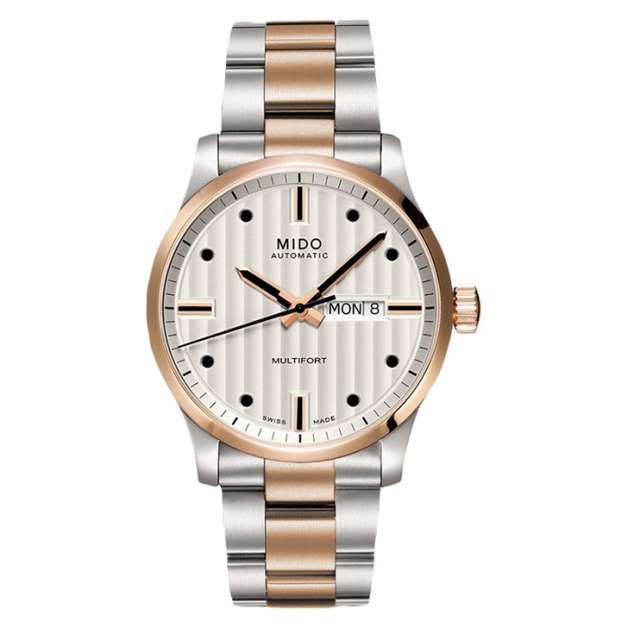 Warranty : 2 Years of Warranty Water resistance : 10 bar (100 m / 330 ft) with screwed crown Modele No. M005.430.22.031.80 Collection : Multifort Lugs width (mm) : 22.00 Case shape : Round Thickness (mm) : 11 Width (mm) : 42.00 Case length (mm) : 42.00 Case options : See-through case back, Screw-down crown Case Material : Stainless steel with gold PVD coating Crystal : Sapphire crystal Movement : Mido Automatic Power reserve : Power reserve up to 80 hours Functions : Date, Day Caliber : Automatic Mido Caliber 80 (base ETA C07.621) Strap details : Stainless steel