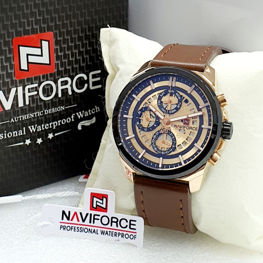 Deskripsi Product : - Brand : Naviforce - Model Number : NF9129 - Material : All Stainless Steell & Tali Kulit - Diameter : 4.5cm - Feature : Tanggal Hari Aktif - Water Resistant 3 ATM - Movement : Quartz - Display Type : Analog Original Garansi Resmi Naviforce