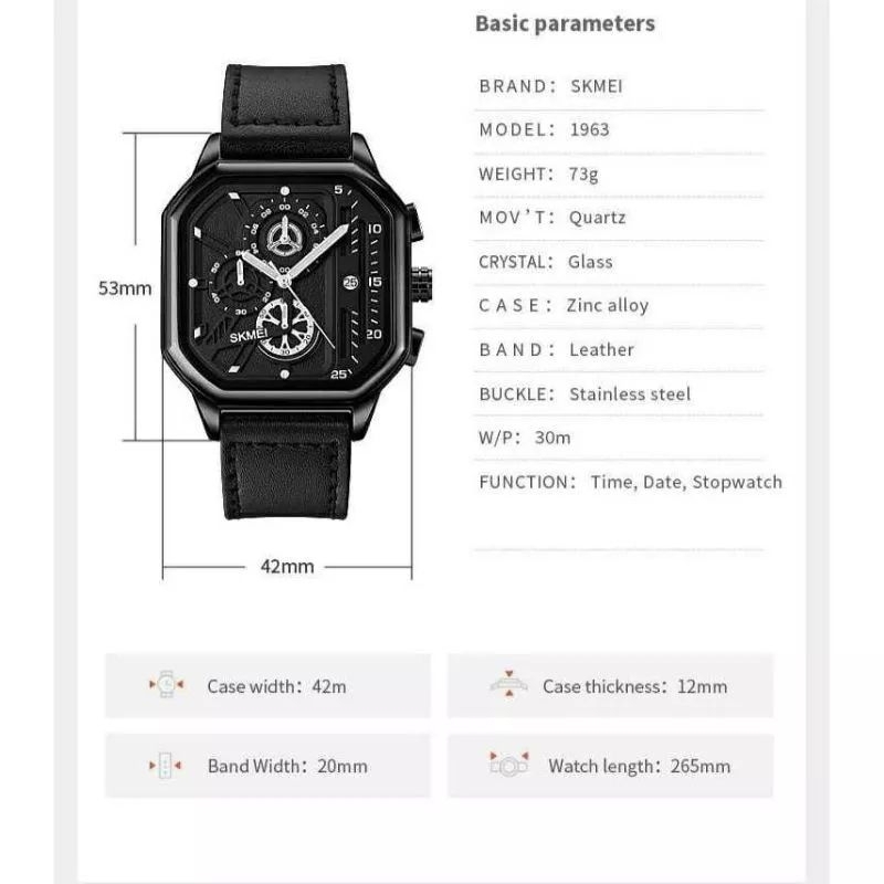 Spesifikasi SKMEI Jam Tangan Pria Analog - 1963 Diameter Jam 42mm Jenis Kelamin Pria Material Kulit Sintetis Dimensi Ketebalan Dial: 12 mm Lebar Strap: 20 mm Panjang Strap: 265 mm Jam ini memiliki model yang sangat sporty dan trendy. Jam ini dapat terendam dalam air selama tidak ditekan tombol dalam air.