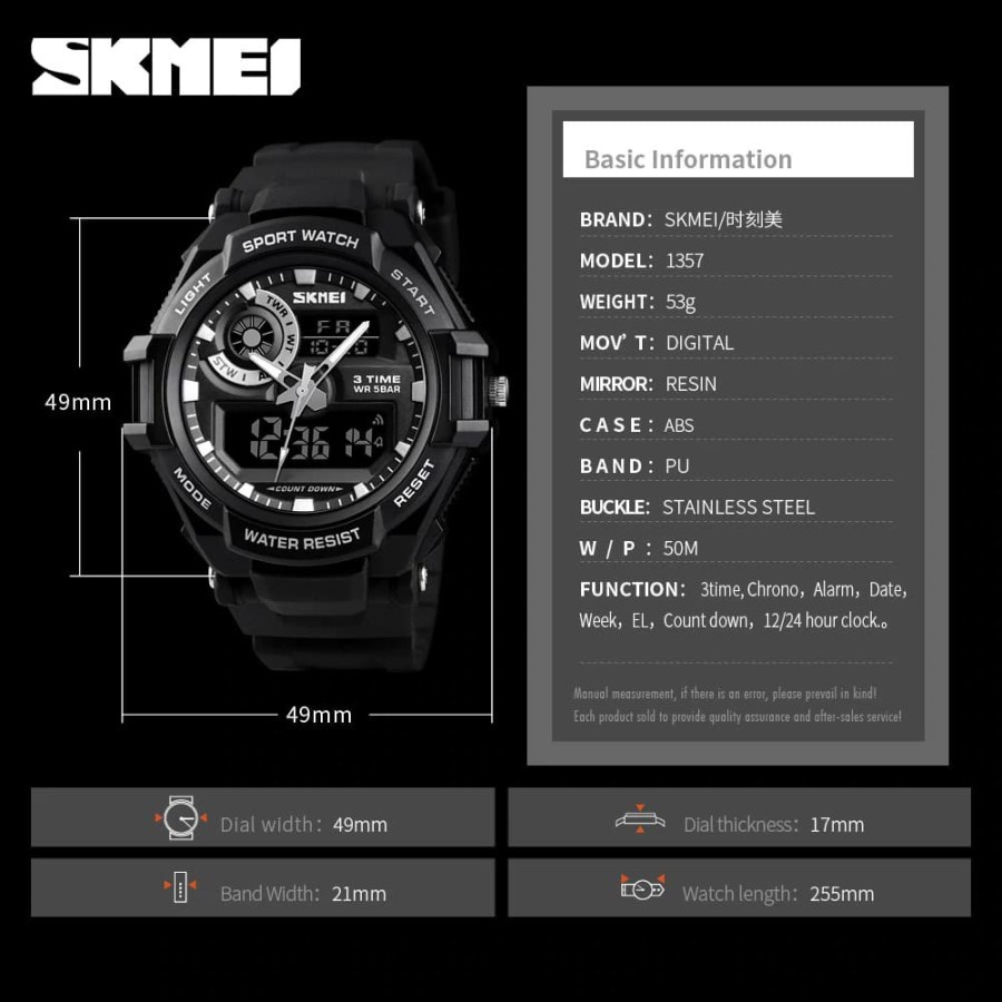 BRAND: SKMEI Model: 1357 Tali/Strap: Rubber/Karet Diameter Jam: 49mm Jenis Kelamin: Pria Dial Thickness: 17 mm Band Width: 21 mm Band Length: 255 mm FITUR: - tokopediadotcom/skmei - DOUBLE TIME - DATE - ALARM - STOPWATCH - EL LIGHT - 50M WATERPROOF