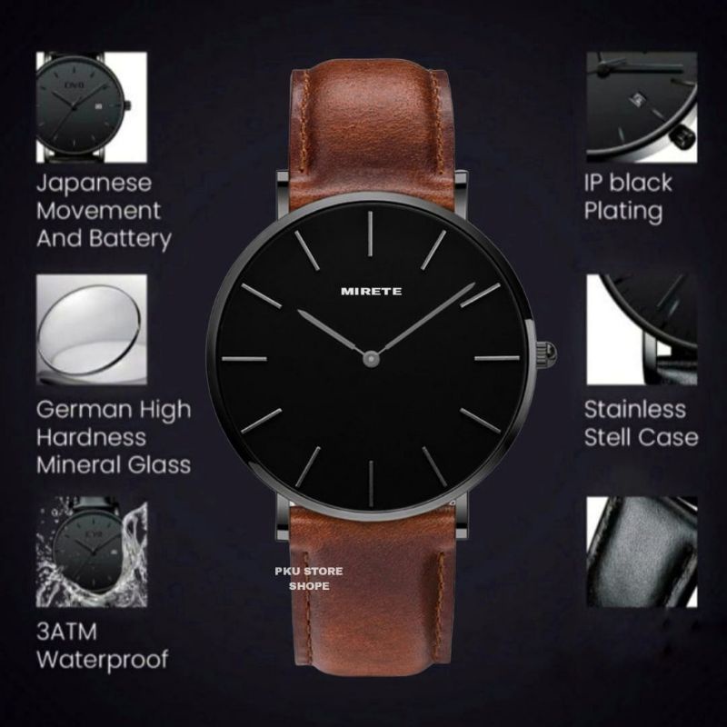 Merek : Mirete Case : Stainless Steel Strap : Kulit Diameter : 4mm Water Resistantce / Tahan Air Fitur : Jam, Menit , Detik Free Batrai Cadangan Free Boubbl Warp