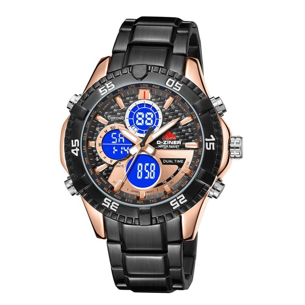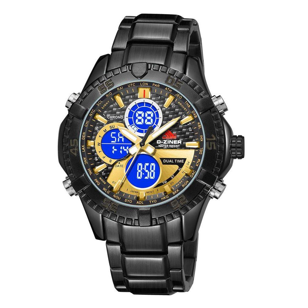 JAM TANGAN D-ZINER 8258 ORIGINAL, DESIGN KASUAL • Type : 8307 • Gender : Pria • Type : Dualtime • Diameter Case: 5,5cm • Tebal Casing : 2 cm • Lebar Tali : 2,4 cm • Bahan Casing : Stainless Steel • Water Resistant: 3 ATM FITUR: • Lampu Layar LED • Stopwatch & Alarm • Date & Calendar