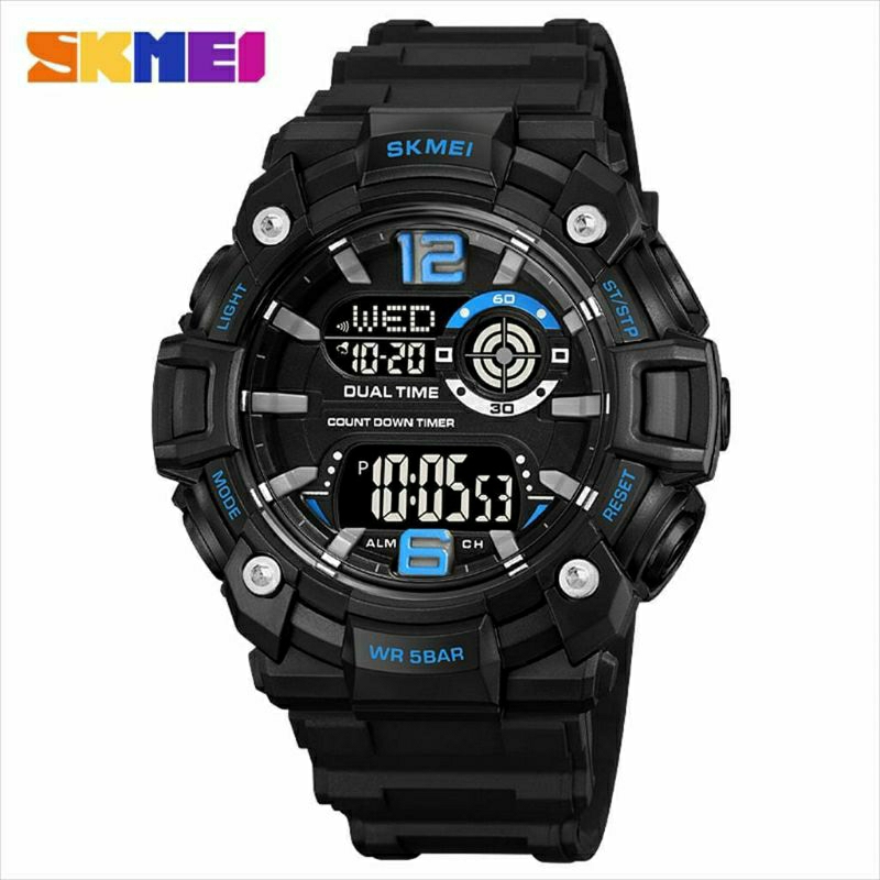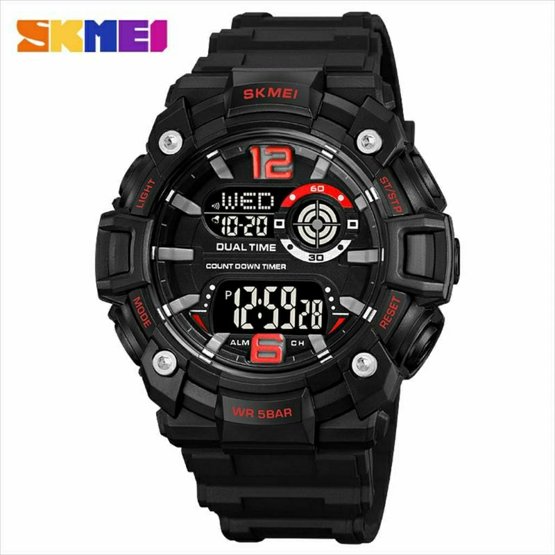 Brand: SKMEI Model : 2018 Gender : Pria Grade : Original. Movement : Japan Quartz Dial Diameter : 56mm Case Thickness : 20mm Band Width : 22mm Band Length : 26.5cm Case Material : ABS+PU Band Material : Rubber Functions : 2Time, Alarm, Date, Stopwatch, El light, 12/24 H Water Resistant : 5 ATM.