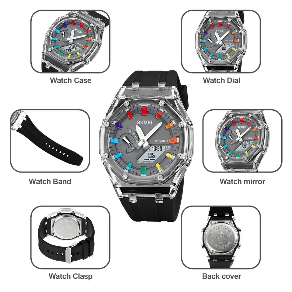 Deskripsi👇: Brand : SKMEI Model : 2100 Gender : Pria Diameter Case : 5,3 cm Tebal Casing : 1,4 cm Lebar Tali : 2,0cm Panjang Tali : 24,5mm Bahan Casing : PC Bahan Tali : Silica Gel Jenis Clasp : Pin Buckle Water Resistant : 5ATM Display : Digital Analog Fitur : World Time, Chrono, 5 Alarm, Date, Week, LED Light, Count Down, 12/24 Hours Clock