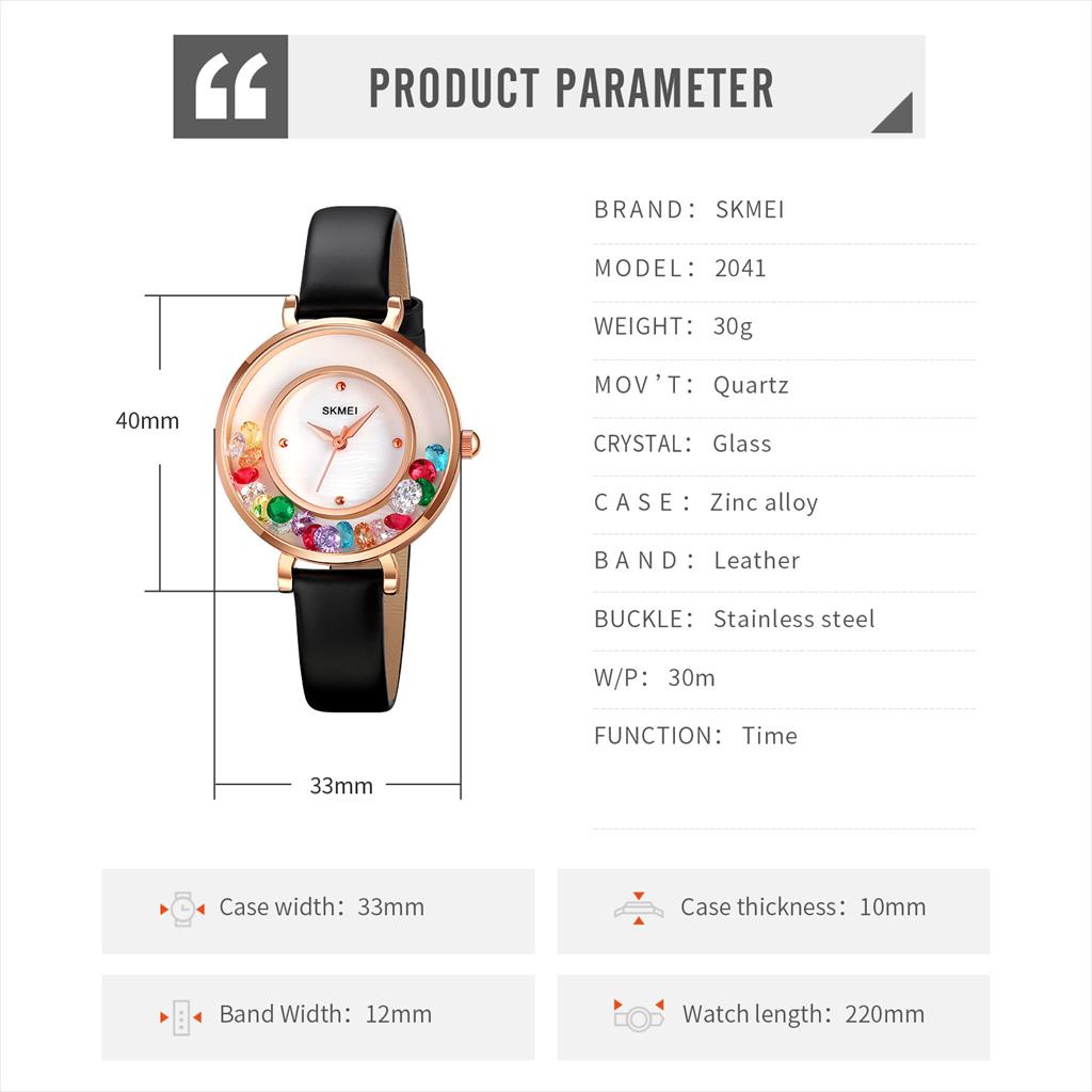 Fitur Produk 1.Model:SKMEI wanita kuarsa jam tangan 2041 2. Gerakan: kuarsa 3. Cermin: kaca 4. Kasus: paduan seng 5. Gesper: Baja tahan karat 6. Tahan air: 30m/3Bar 7. Tali: kulit 8. Fungsi: Waktu 9. Asli: Ya