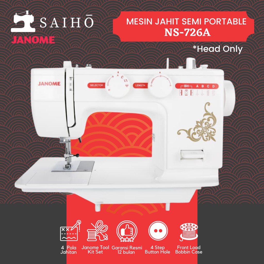 Mesin Jahit Semi Portabel Tipe: JANOME NS 726A SISTEM DINAMO LUAR, HANYA MESIN *Semi - Portable Multifungsi (tidak membutuhkan meja dan kaki untuk digunakan, namun disarankan untuk menggunakan meja dan kaki mesin jahit atau box mesin jahit dalam pemakaiannya)