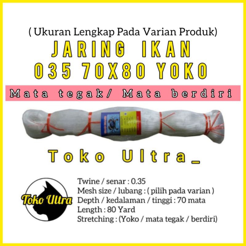 (UKURAN LUBANG PILIH PADA VARIAN PRODUK) JARING IKAN 0.35 70X80 YOKO (MATA TEGAK) - spesifikasi : jaring senar 0.35 jumlah mata / kedalaman : 70 mata panjang : 80 yard (73 meter)