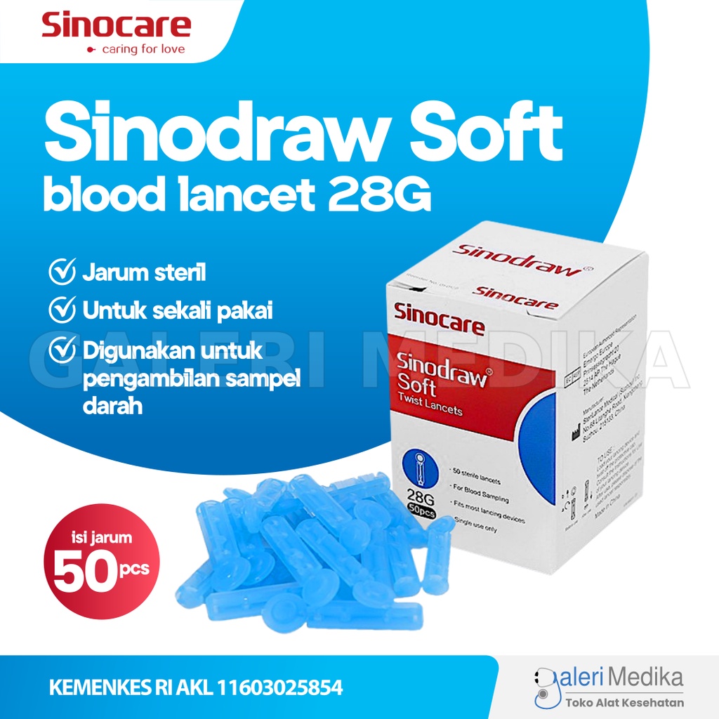 #Jarum Sinocare Sinodraw Blood Lancet 28G dikemas secara higienis, setiap jarumnya dipasang dengan tutup pengaman, dapat dibuka atau dipatahkan pada saat jarum akan digunakan. Dengan kualitas material yang terjaga menjamin ketajaman dan ketahanan jarum, sehingga meminimalkan rasa sakit pada saat pengambilan sampel darah.