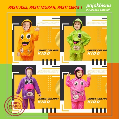 Jas hujan jaket celana bermerek Kido untuk si kecil (umur 4 - 7 tahun). Tersedia dalam 4 varian motif lucu seperti digambar: pink, ungu, kuning, hijau. Terbuat dari bahan PVC.