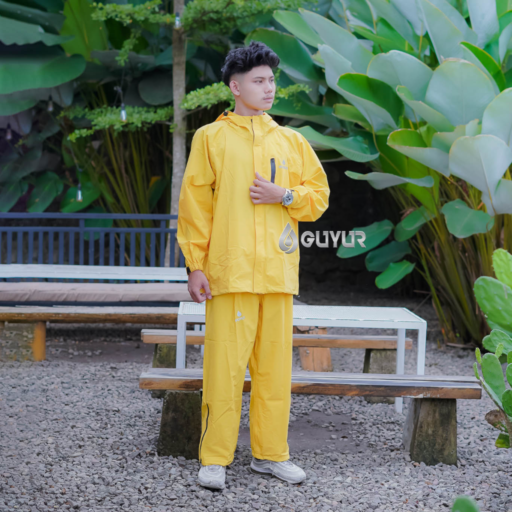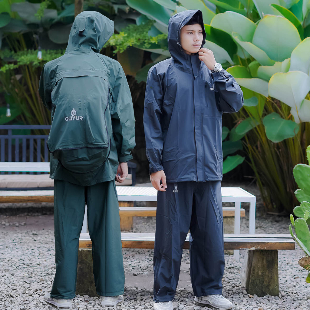 as Hujan guyur dengan Tas Belakang ( Backpack ) yang berfungsi untuk melindungi tas punggung dari hujan Keunggulan jas hujan guyur model ransel 1. bahan parasit campuran karet premium kuat dan tebal ga mudah sobek saat di gunakan 2. pengerjaan di jahit dan di pres sealing melindungi masuknya air dari sela jahitan ( kebayakan jas hujan yg beredar di pasaran di jahit tampa di pres sealing mengakibatkan bocor dari sela jahitan) 3. di lengkapi saku / kantong di bagian depan untuk menaruh hp atou barang berharga 4. di bagian depan di lengkapi resleting waterproof dobel velcro perekat 5. Yang paling utama adalah bagian belakang jas hujan menggunakan sistem Back Pack sehingga bila para bikers membawa tas punggung tidak akan merasa kesempitan dan mengurangi resiko jas hujan cepat rusak ( jas hujan tidak dipaksa ditarik untuk melindungi tas )